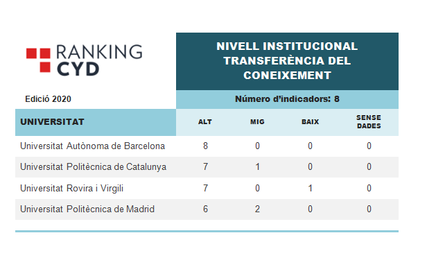 A banda de les classificacions per indicadors, els editors del rànquing faciliten informació addicional sobre el nombre d’ítems per grup de rendiment (alt, mig o baix) que obté cada institució. D’aquesta manera, com a institució, la UPC se situa en les primeres posicions de l’Estat en la dimensió de transferència del coneixement: en concret, se situa en segon lloc en el sistema universitari espanyol.