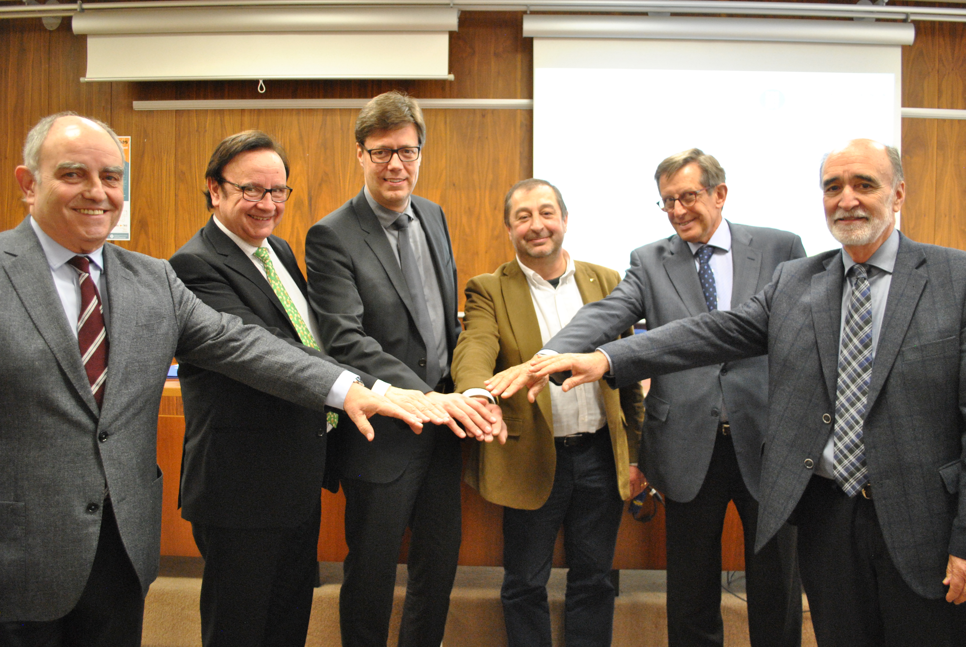 A la imatge, d’esquerra a dreta: Josep Bombardó, president de la Fundació per la Indústria Sabadell; Salvador Maluquer, director general de la Fundación Textil Algodonera; Xavier Roca, director de l’ESEIAAT; Francesc Torres, rector de la UPC; Joan Roma, president del Col·legi de l'Art Major de la Seda i Josep Armengol, president de la Fundació Institut Industrial i Comercial