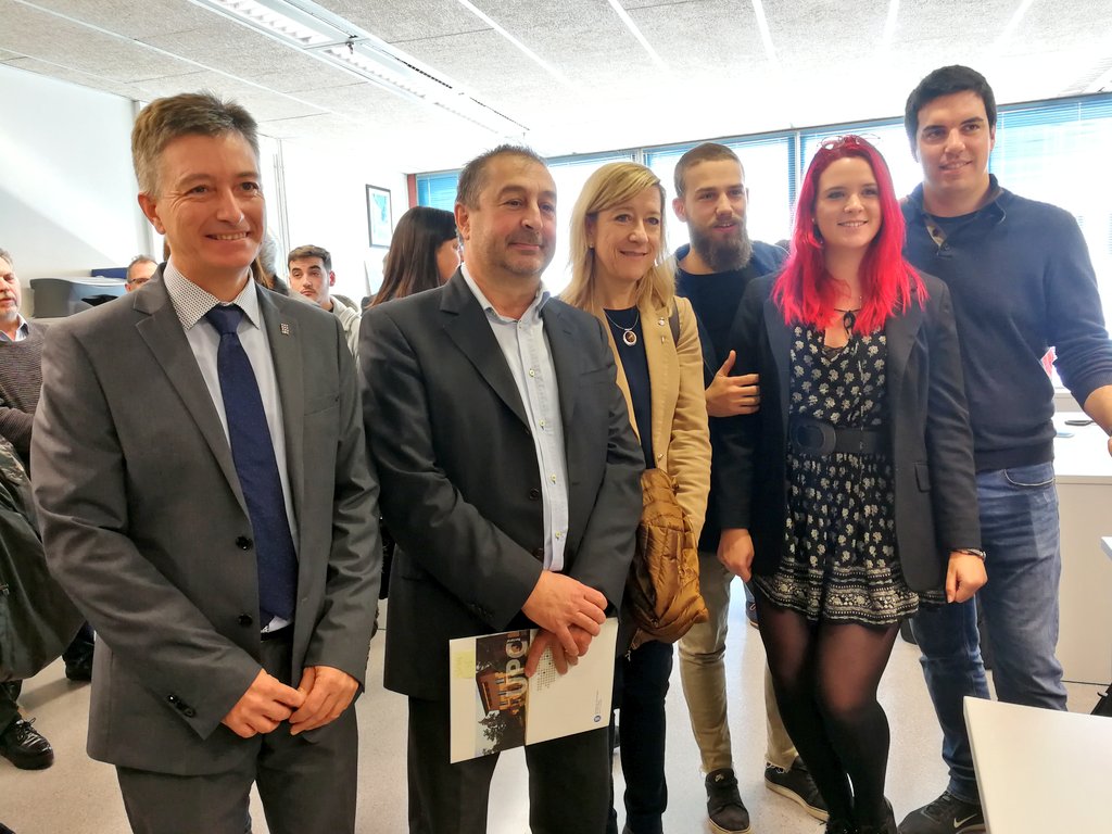 Frederic Vilà, Francesc Torres i Neus Lloveras juntament amb estudiants que desenvolupen projectes a l'Espai Emprèn