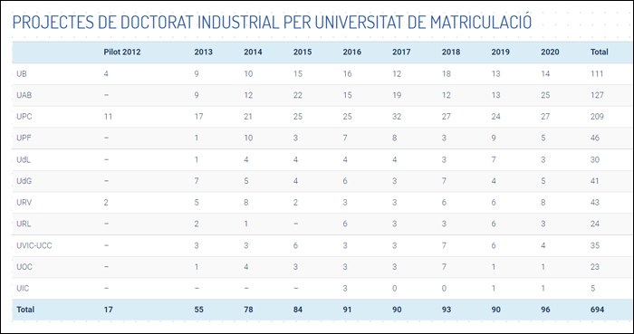 Segons la Memòria del Pla de Doctorats Industrials de la Generalitat de Catalunya, el 2020 es van realitzar 96 projectes de Doctorat Industrial a les universitats catalanes, el 28 % dels quals corresponen a doctorands i doctorandes de la UPC (27 projectes). Pel darrera de la UPC, figuren en el rànquing la Universitat Autònoma de Barcelona (25) i la Universitat de Barcelona (14).