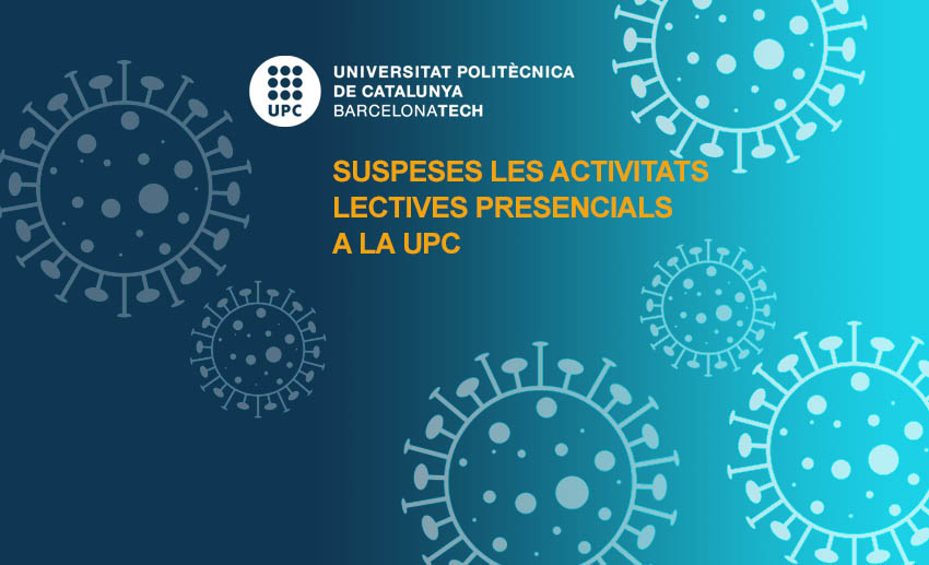 La Universitat Politècnica de Catalunya · BarcelonaTech (UPC) ha suspès la seva activitat lectiva presencial per als propers 15 dies. La suspensió és prorrogable en funció de la situació d’emergència de salut pública i de les indicacions que traslladi el Govern de la Generalitat de Catalunya.