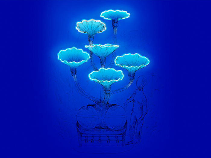 Per respondre al primer 'Com podem integrar els microorganismes per dissenyar ciutats més sostenibles?', Samira Benini proposa la instal·lació híbrida que combina art i ciència 'Geo-Llum', una solució imaginativa i sostenible al paper de l’enllumenat públic en els espais urbans.