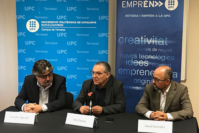 Amadeu Aguado, cinquè tinent d’alcalde de Cultura, Innovació i Projecció de la Ciutat de l’Ajuntament de Terrassa; Enric Fossas, rector de la UPC, i David González, sotsdirector de Projectes d'Estudiants de l'ESEIAAT