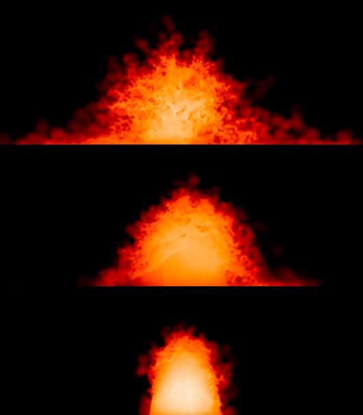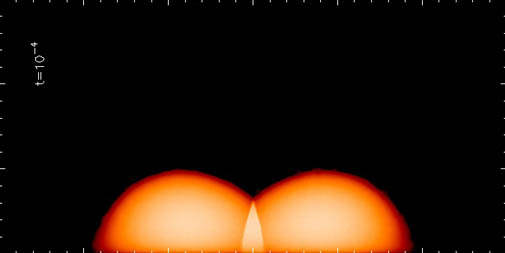 Mapa de densitat de la col·lisió de dos estels de neutrons (en l'etapa final). Simulacions en 2-dimensions realitzada per Rubén Cabezon (de la seva tesi doctoral, dirigida per Domingo García-Senz)