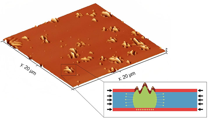 Imatge de la corrugació superficial i esquema de l’evolució del líquid fent servir la metodologia desenvolupada en aquesta recerca, on el vidre ultraestable (blau), s’insereix entre dues capes de vidre d’alta temperatura de transició (vermell). En incrementar la temperatura es formen zones líquides (verd) que creixen i pressionen la superfície superior, tot provocant deformacions que poden ser mesurades amb el microscopi de forces atòmiques (imatge superior).