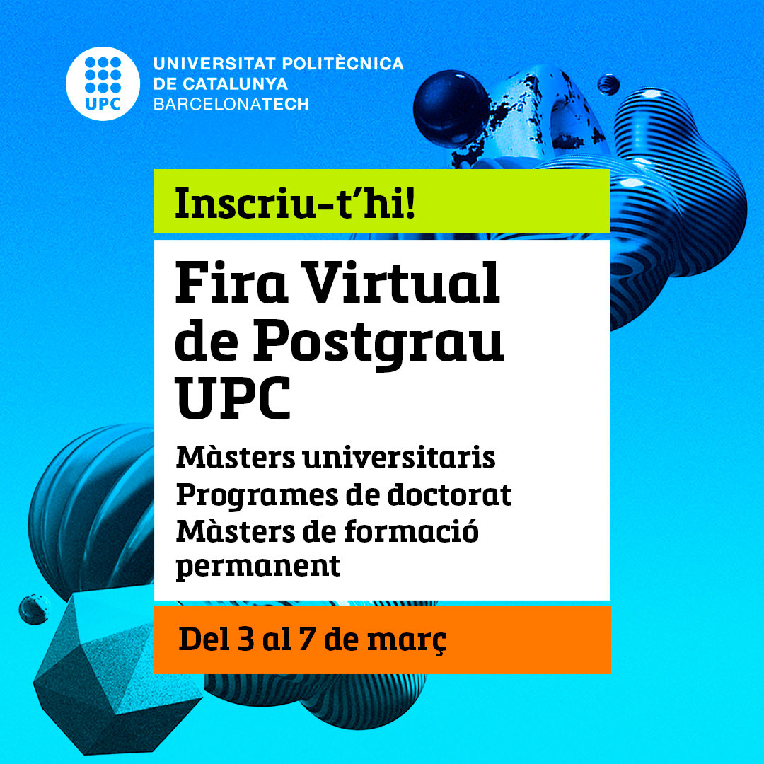 La Fira Virtual de Postgrau de la Universitat Politècnica de Catalunya - BarcelonaTech (UPC) té lloc del 3 al 7 de març amb un ampli programa de sessions informatives en format on line sobre l’oferta de màsters universitaris, programes de doctorat i màsters de formació permanent en els àmbits de l’enginyeria, l’arquitectura, les ciències i la tecnologia. A través de sessions informatives en directe, el professorat dels diferents estudis explica el contingut acadèmic dels programes, el pla d’estudis, les sortides professionals i resol els possibles dubtes.