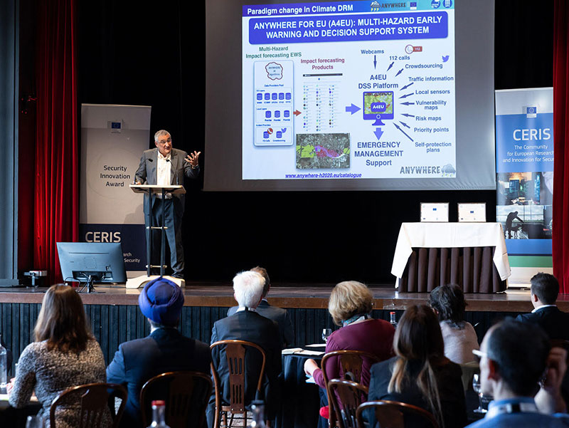 Daniel Sempere, director del CRAHI de la UPC, presentant el projecte ANYWHERE a l'acte de lliurament dels Security Innovation Awards