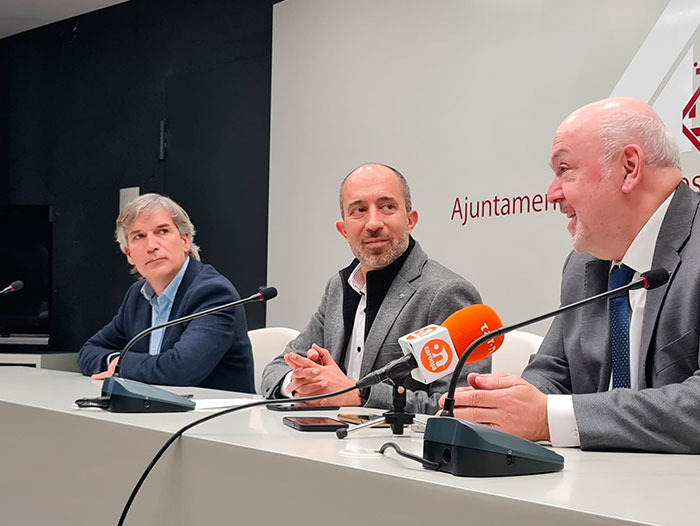 D'esquerra a dreta: Xavier Massó, l'alcalde Marc Aloy i el rector Daniel Crespo, durant l'acte de presentació del nou director del projecte, el 18 de gener