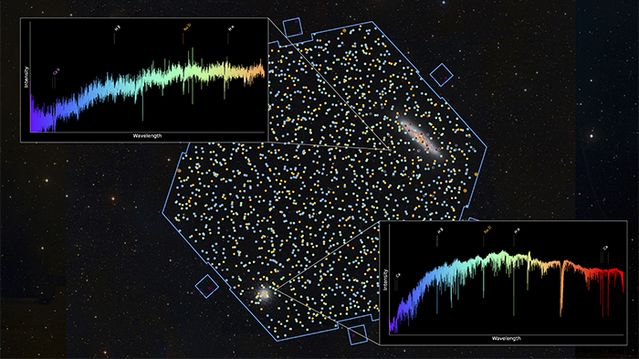El camp de visió de la primera llum amb exemples d'espectres. Imatge: AIP/R. de Jong, Centre de Recherche Astrophysique de Lyon/J.-K. Krogager, Background: Harshwardhan Pathak/Telescope Live