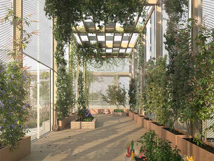 Simulació de l'espai comunitari previst a la coberta de l'ampliació. Imatge: Render de Recuerdo Studio