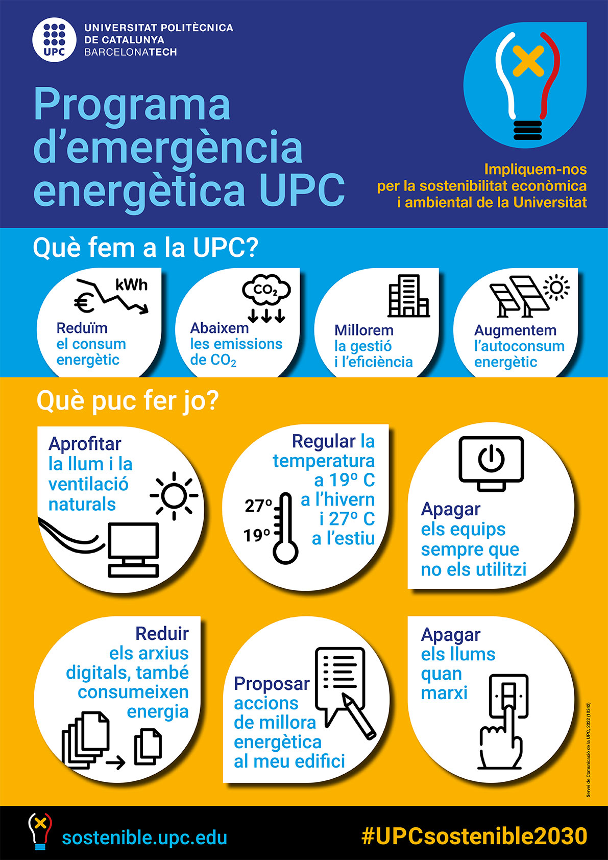 La UPC ha iniciat una campanya per donar a conèixer el Programa d’emergència energètica, centrat en reduir el consum energètic i fer front a l’augment del preu de l’energia. La desconnexió programada d’equips tècnics no imprescindibles a partir del 2 de desembre i el taller SIRENA per conèixer el consum energètic de cada edifici són les dues primeres accions previstes per conscienciar i implicar la comunitat universitària en l’estalvi energètic.