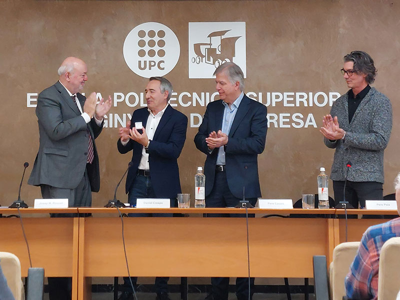 El professor de l'EPSEM Josep Maria Rossell rep la insígnia d’or de la UPC a mans de Daniel Crespo, rector de la Universitat. A la fotografia, amb Pere Casals, president del jurat del Premi UPC a la Qualitat en la Docència Universitària 2022, i Pere Palà, director de l'EPSEM