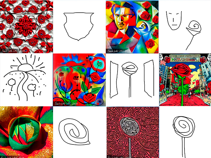 La intel·ligència artificial (IA) i la informàtica aplicades a l’art generen una imatge amb models de 'deep learning'. Amb aquesta tecnologia, la UPC ofereix, per aquest Sant Jordi, la possibilitat de triar una rosa digital, o de generar-ne una de pròpia única, a partir d’un dibuix i d’un text associat. La imatge de la rosa és modificada per l’algorisme, que l’aproxima a l'esbós que s’hagi dibuixat i al text introduït. #RosaUPC23 s'ha presentat en el marc de Sant Jordi Digital, celebrat el 19 d'abril a la UPC.