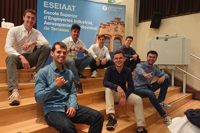 Els estudiants de la UPC-ESEIAAT que han fundat KreiosSpace: d'esquerra a dreta, a la filera superior, Max Amer, Francisco Boira, Adrià Barceló i Iker Blanco. A la filera inferior, Francisco Bosch, Jan Mataró i Adrián Senar