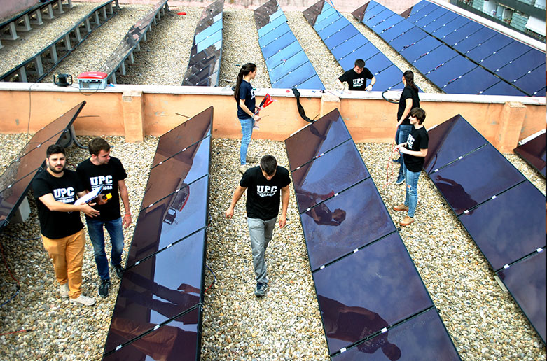 Un 100 % de l'electricitat consumida per la UPC durant el 2018 procedeix ja d'energia verda, segons l'informe Sirena, que s'ha donat a conèixer el 5 de juny, Dia Mundial del Medi Ambient. A la imatge, estudiants i estudiantes de diverses branques de l'enginyeria instal·lant les plaques fotovoltaiques al Campus de Terrassa el curs anterior.
