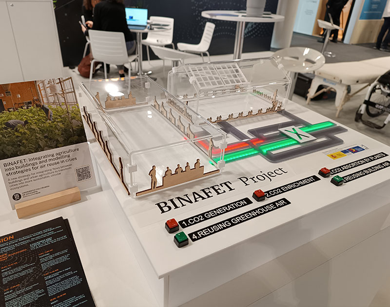 Maqueta interactiva que mostra la integració de fluxos entre edificis i agricultura urbana per a una transició ecològica en les ciutats, desenvolupada en el marc del projecte BINAFET