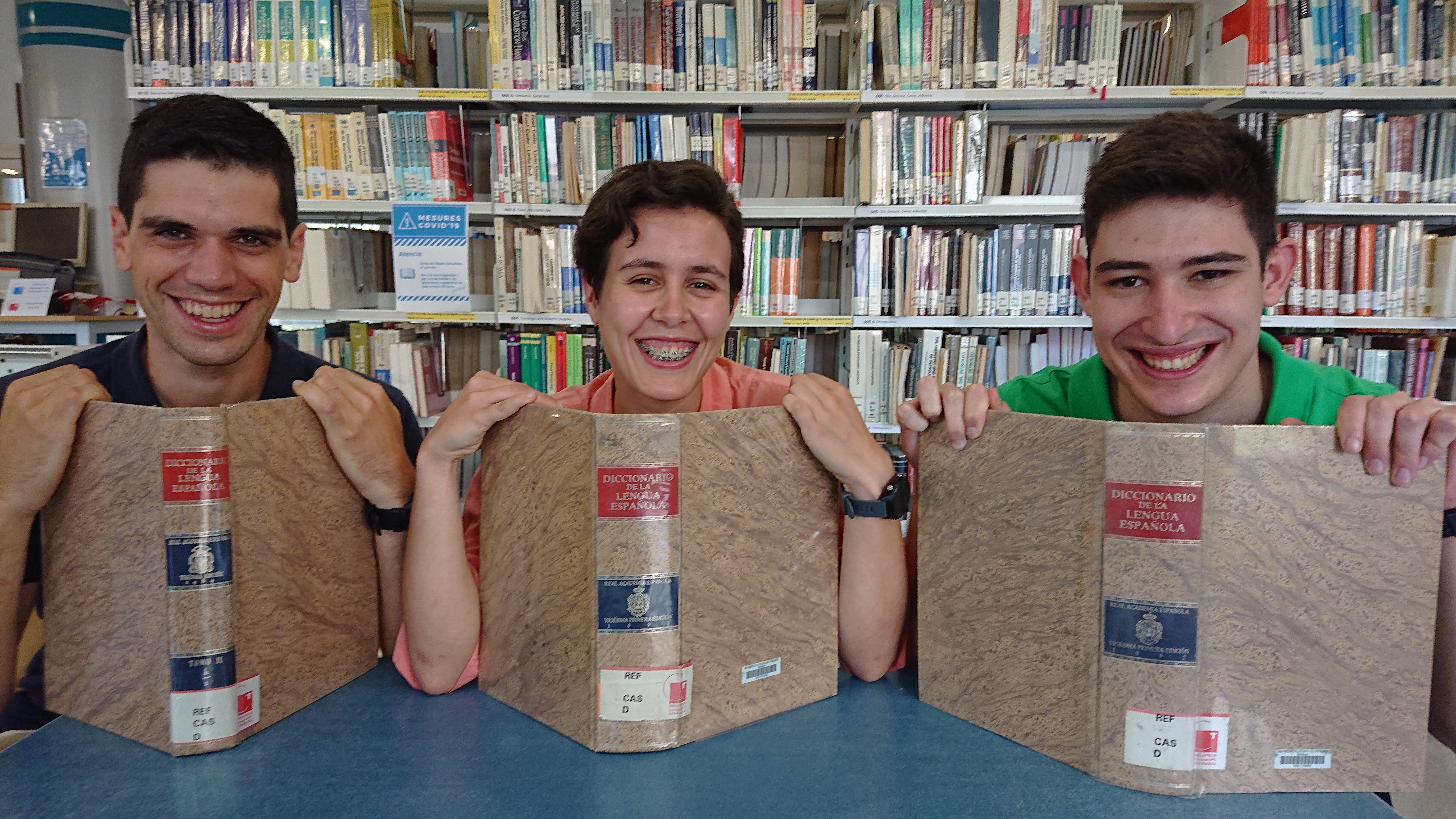 D'esquerra a dreta, Pol Fontanes, Eva Maria Urbano i Víctor Martínez, amb sengles diccionari de la RAE
