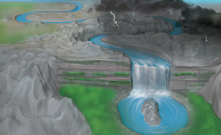 Representació artística d'una transició induïda per desordre a la fase d'aïllament topològic d'Anderson. Un riu que flueix al llarg d'un camí recte és alterat pel desordre en el paisatge subjacent. Després de passar per una transició (cascada), el riu forma un circuit tancat, una forma amb una topologia diferent a la del camí inicialment recte. A la fase d'aïllament topològic d'Anderson, l'estructura de banda trivial d'un material normal es transforma en una estructura de banda topològicament no trivial degut al desordre en els acoblaments entre els llocs de la xarxa. L’índex en la fase de l'aïllant topològic d'Anderson és diferent al del cas normal sense desordre. Imatge de Lachina Creative, copyright Bryce Gadway, Universitat d'Illinois a Urbana-Champaign.