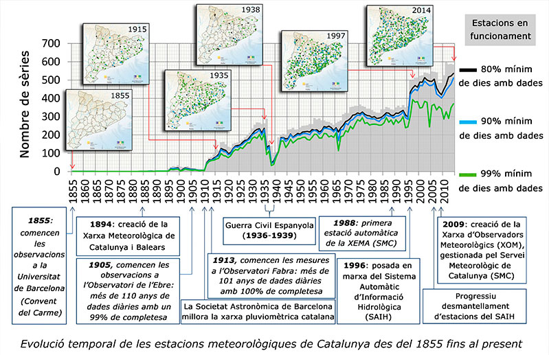 Segons informació publicada a la revista El Cultivador (vol. 1-5, 1848-1852), és possible que hi hagi dades anteriors al 1855, com a mínim del 1848, però actualment el Servei Meteorològic de Catalunya només ha recuperat i incorporat els registres a la base de dades a partir del 1855. "Al segle XIX, les mesures les feien persones interessades en la meteorologia, i especialment metges que registraven dades de pluja per poder extreure conclusions de l’efecte que provoquen les condicions meteorològiques en la salut", detalla Llabrés. El fet que a Catalunya es disposi d’un volum de sèries tan gran i d’una àmplia cobertura temporal és degut principalment a la tasca de rescat que ha fet el Servei Meteorològic de Catalunya.
