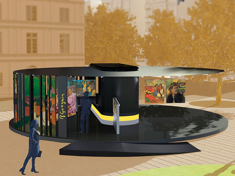 La solució proposada consisteix en una plataforma mòbil multifuncional que combina un cilindre central −que fa de cabina del vehicle−, amb una zona posterior rectangular d’emmagatzematge que compta amb panells solars per recarregar la bateria del sistema de propulsió elèctric. Les zones laterals d'aquesta estructura incorporen pantalles que poden projectar diferents informacions al públic. Un cop instal·lada i desplegada, l’estructura es pot configurar com una galeria per exposar obres d’art o com a escenari per a la representació d'obres de teatre, gràcies al seu sistema de panells i a la il·luminació LED, que permet recrear diferents entorns.