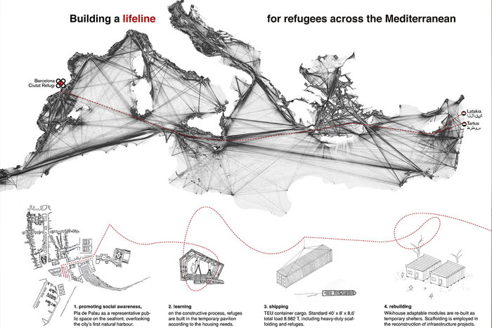 L’estudiant Mónica Sambade, per la seva banda, planteja com l’arquitectura pot proporcionar una alternativa a les persones refugiades en el projecte People in Motion: In-Transit Architecture for New Production Backgrounds. El seu treball planteja el disseny d’un pavelló per acollir refugiats ubicat a una zona cèntrica de Barcelona, a la plaça de Pla de Palau, davant del Port Vell. La instal·lació plantejada per l’estudiant té forma de contenidor i està pensada perquè recordi a un dels vaixells barats al port. Es tracta d’un gran espai diàfan que destaca pel seu mètode de construcció, molt senzill i ràpid, com si fos un gran mecano de ferro.