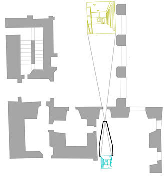 Emplaçament on hauria estat la cambra obscura al despatx del rei Felip IV, segons les perspectives que tenen el quadre gran i el petit