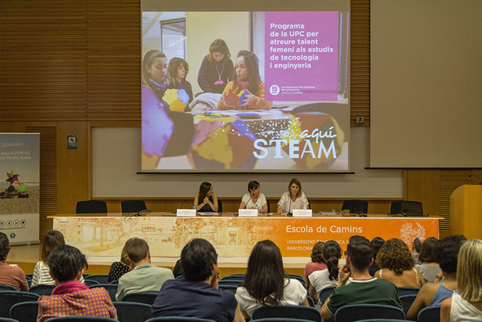 El 26 de juny, la sala d’actes de l’Escola de Camins, al Campus Nord de Barcelona de la Universitat Politècnica de Catalunya · BarcelonaTech (UPC), va acollir la presentació del programa ‘Aquí STEAM’, amb el qual la UPC vol trencar els estereotips i rols de gènere establerts en la societat i fer visibles nous referents femenins d’una manera atractiva i propera per a les noies. Per fer-ho, la UPC ofereix a les escoles i als instituts que hi participen un conjunt d’accions que valoren els àmbits STEAM (ciències, tecnologia, enginyeria, art i arquitectura) i que demostren que les capacitats professionals no estan vinculades al gènere.