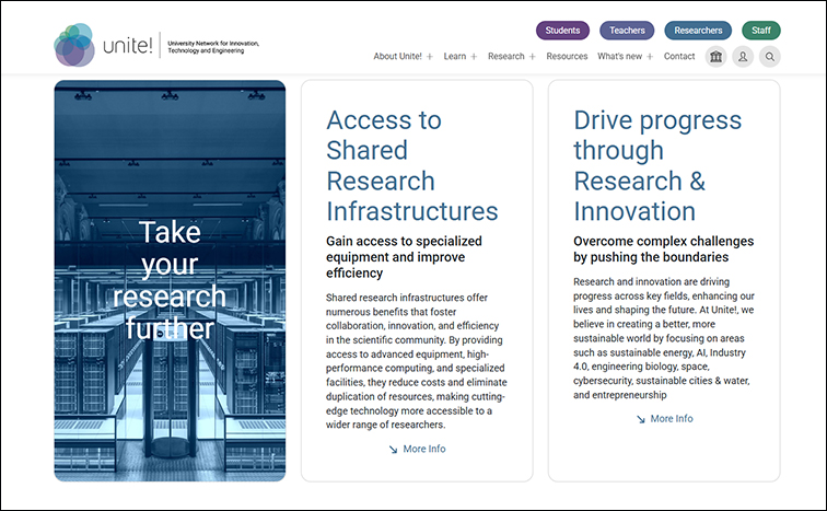 La nova web de l'aliança europea Unite!, que ofereix una millora en l’experiència dels usuaris, disposa d'una estructura segmentada per públics i mostra l’avenç dels projectes i els diferents catàlegs de formació i recerca.