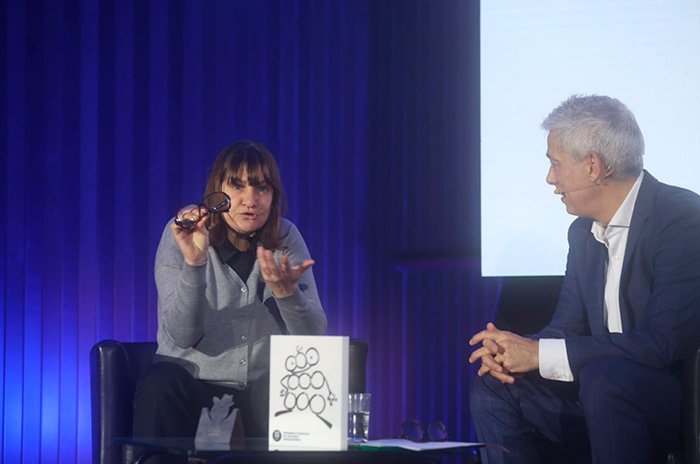 Mireia Ferraté Casas, en un moment de la conversa amb el periodista Albert Om en què mostra les icòniques ulleres del seu pare, Gabriel Ferraté