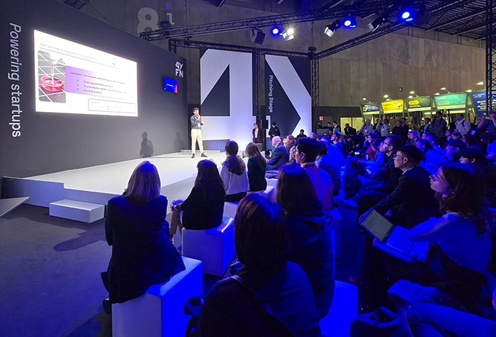 Un dels joves emprenedors presentant la seva empresa emergent a la UPC Pitching Session, en el marc del 4YFN