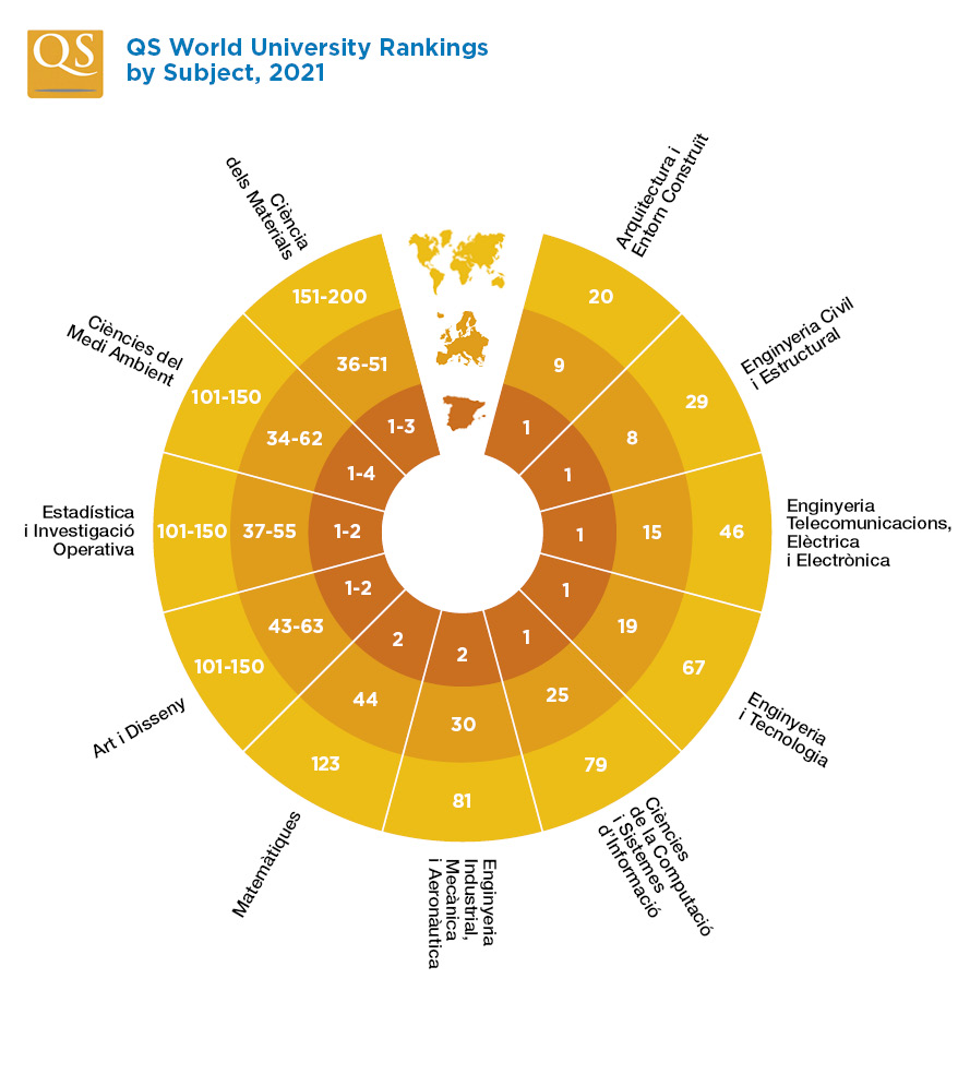 En l’edició 2021 del QS World University Rankings by Subject (QSWUR by Subject) que s’ha publicat el 3 de març, la UPC se situa com la 20a millor universitat del món en la disciplina d’Arquitectura i Entorn Construït, en el lloc 29 del món en la d’Enginyeria Civil i Estructural, i en el lloc 46 en la d’Enginyeria de Telecomunicació, Elèctrica i Electrònica. En el camp de l’Enginyeria i Tecnologia, la Universitat escala posicions i passa de ser la 76a millor universitat del món el 2020 a ser la 67a aquest any i es manté líder a l'Estat.