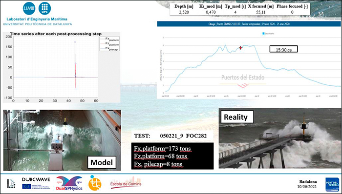 Investigadors del Laboratori d'Enginyeria Marítima (LIM) de la UPC han presentat les conclusions dels estudis tècnics i d'onatge realitzats per encàrrec de l'Ajuntament de Badalona amb l'objectiu de garantir que la reconstrucció del Pont del Petroli resisteixi temporals com el Glòria, que va malmetre el pont el gener del 2020.