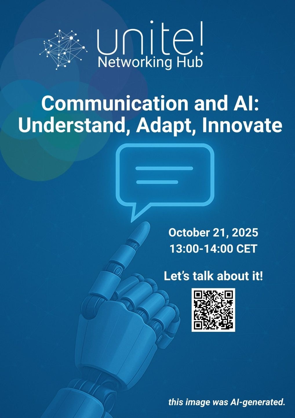 El proper dimarts 21 d’octubre a les 13 h (CET) tindrà lloc la primera sessió del Networking Hub, un nou espai virtual adreçat al PDI i al PTGAS de la UPC i de les universitats sòcies de Unite!. Aquesta primera sessió se centrarà en com la intel·ligència artificial està transformant la comunicació, com entendre la IA en el context de la comunicació; quines són les estratègies per adaptar-s’hi i innovar, les oportunitats i reptes que planteja o les noves competències professionals que s’estan configurant.