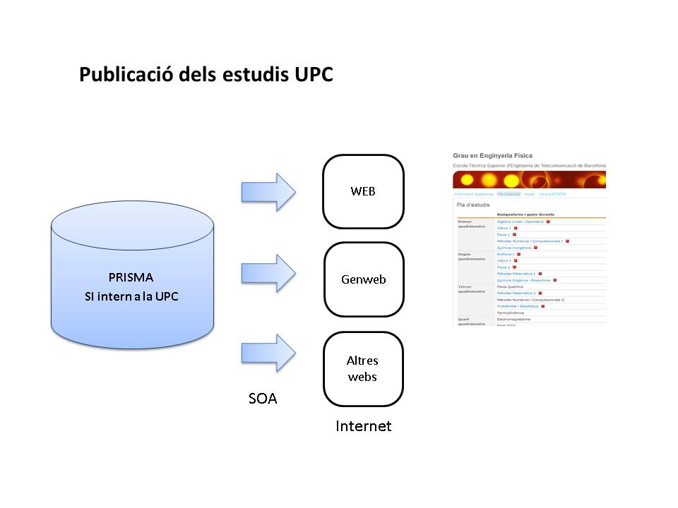 El bus SOA (Service Oriented Arquitecture) de la UPC és una plataforma que ens permet accedir a diferents continguts de la UPC per poder publicar-los. Un exemple poden ser les guies docents de les assignatures, disponibles a la base de dades PRISMA.