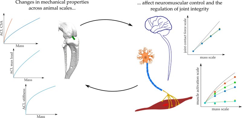 Estudis recents han demostrat que la mida del sistema musculoesquelètic d’un animal pot afectar l’estratègia de control neuronal. Les propietats viscoelàstiques passives de les extremitats juguen un paper important en animals de petites dimensions, però són menys importants en animals de grans dimensions. Aquest estudi va més enllà i analitza com afecta la dimensió de l’animal a la integritat de l’articulació, és a dir, com es prevenen forces de contacte articulars massa altes que provocarien la dislocació de l’articulació o una degradació del cartílag. Primer es presenta una revisió de la literatura per avaluar com les propietats dels lligaments responsables de la integritat articular varien en funció de l’escala animal. Seguidament es presenta l’anàlisi de com el control neuronal de l’estabilitat articular es veu afectat per l’escala del sistema musculoesquelètic.