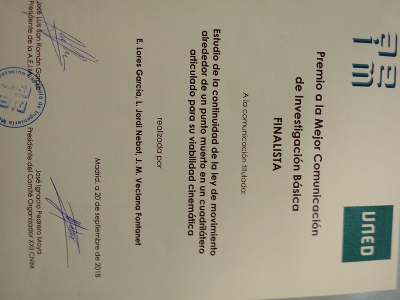 La ponència Estudio de la continuidad de la ley de movimiento alrededor de un punto muerto en un cuadrilátero articulado para su viabilidad cinemática dels professors Eduard Lores, Lluïsa Jordi i Joaquim M. Veciana ha obtingut la nominació de Finalista al Mejor Premio de la Investigación Básica dins del XXII CNIM celebrat a la seu de l’ETSII de la UNED de Madrid del 19 al 21 de setembre de 2018.