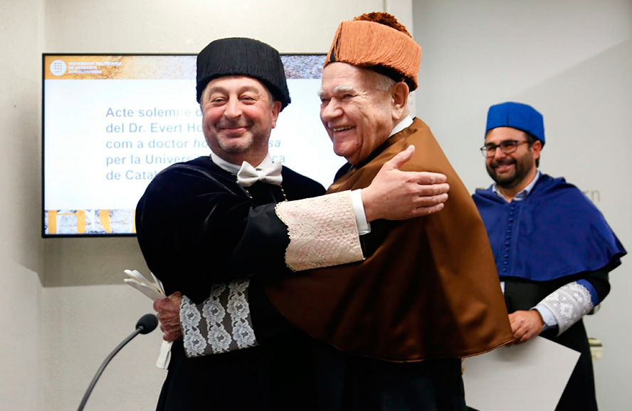 Evert Hoek upon receiving the honorary doctoral degree from Francesc Torres, rector of the UPC