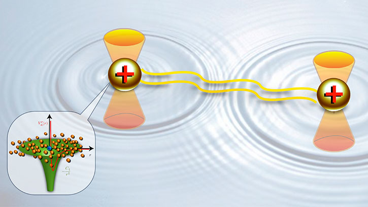 Positively charged ions repel each other. However, when they are immersed in a Bose-Einstein condensate, which is a gas displaying quantum properties at very low temperatures (−273.15°C), the two ions can be attracted to each other. The physical mechanism underlying this attraction is due to the attractive interactions induced by the quantum gas. Despite the fact that even in realistic setups the potential energy of ions is very strong, using a quantum gas as a coolant may bring interesting perspectives for future quantum technologies, such as a quantum computer based on ion chains.