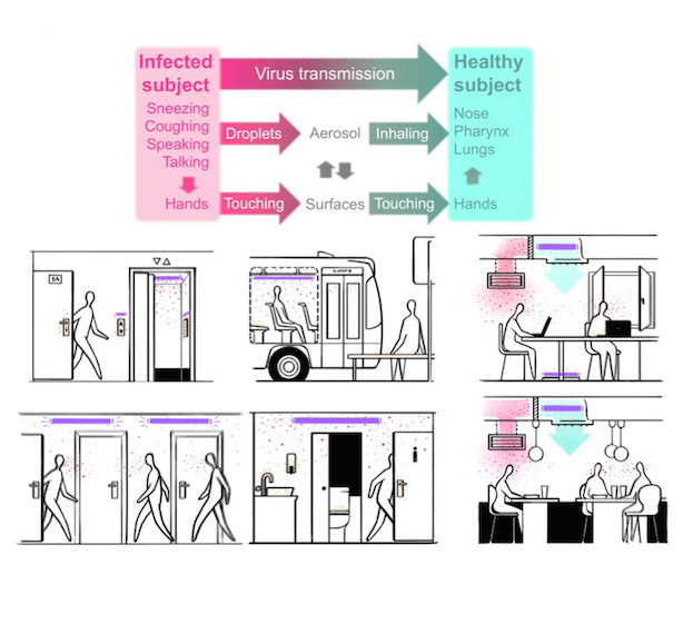 Pathways of viral infection in everyday life shown in a simplified scheme (top) and illustrated by pictorial descriptions of exposure to virus in everyday activities (bottom). Placement of UV-C light sources in ventilation systems and rooms not in use, without direct optical paths to humans, helps reduce virus propagation. Image sketches by Nacho Gaubert.