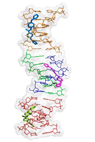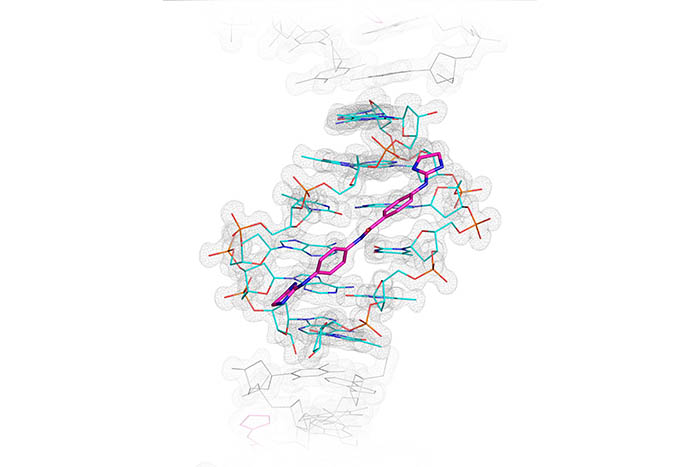 3D structure obtained from the XALOC beamline, showing the kinetoplast DNA with three drug molecules perfectly linked (in blue, pink and phosphorescent green).