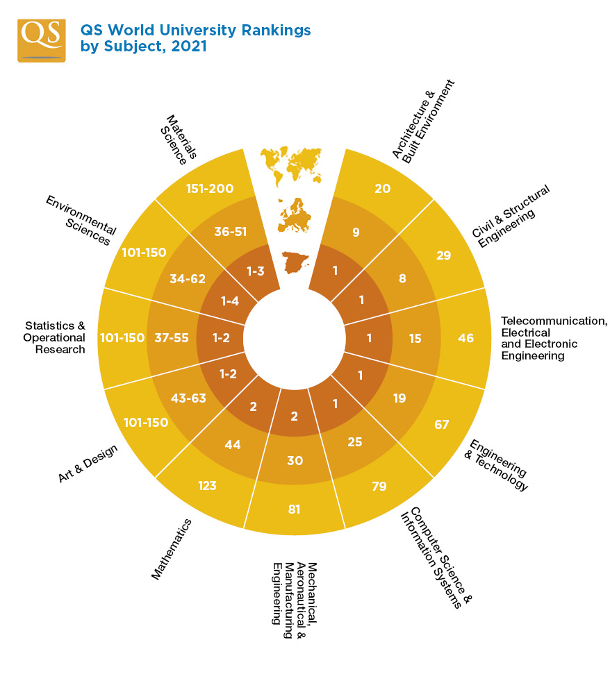 The Universitat Politècnica de Catalunya · BarcelonaTech (UPC) is listed in four subject areas and 15 subjects in the new edition of the QS World University Rankings by Subject. In particular, the UPC stands out as the world’s 20th best university in Architecture and Built Environment, which is one place higher than in 2020, and 29th in Civil and Structural Engineering. The University is also ranked the world’s 46th in Telecommunications, Electrical and Electronic Engineering, climbing several positions from last year’s 51-100 band. The UPC cements its position as the leading Spanish university in these three subjects.