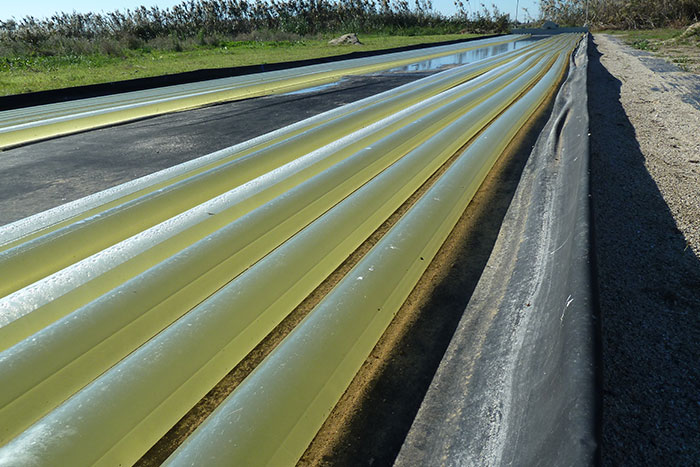 The horizontal tubes of the photobioreactors, manufactured with polyethylene with an anti-UV treatment and forming a two-way circuit.