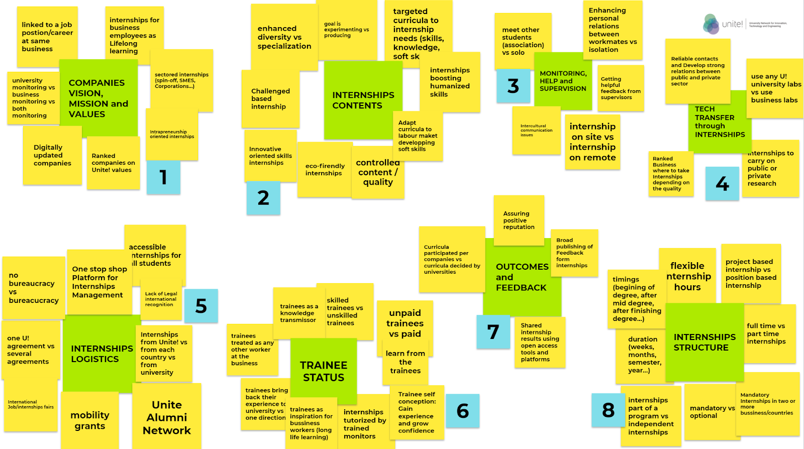 Concepts such as innovation focused internships, entrepreneurship, knowledge transfer or life-long learning training stages have appeared all along the process. Moreover, the participants identified Unite! internships as a solid and reliable way to build up not only engineers, but also conscious and engaged global citizens.