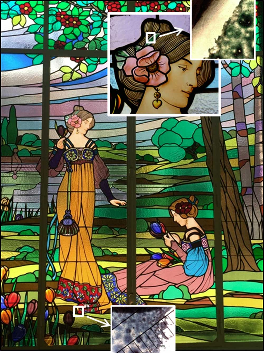 The collaboration of Vitralls Bonet has been absolutely fundamental for this research because they not only provided the materials for replicating the enamels, they offered their collection of small fragments of original enamelled glass, which had been collected over more than a hundred years restoring stained-glass in Barcelona. The stained-glass windows by Rigalt, Granell i Cía that decorate the Barcelona Courthouse or the Sants-Montjuïc District Council headquarters stand out among those studied. Researchers also analysed samples of stained-glass by other prestigious modernist workshops in Barcelona taken from private houses in the Barcelona Eixample (Bordalba workshop) and in Badalona (Buxeres i Codorniu workshop), Palma Cathedral and Sant Jaume de Calaf church (Hijos de Edualdo Ramon Amigó workshop) and the Estació del Nord in Barcelona (Maumejean workshop), among others. One of the samples belongs to one of the most important works of Catalan Modernism, Les Dames de Cerdanyola, displayed in Museu de Cerdanyola del Vallès. It was produced by Ludwig Dietrich, an Alsatian stained-glass artist who moved to Barcelona around 1900.