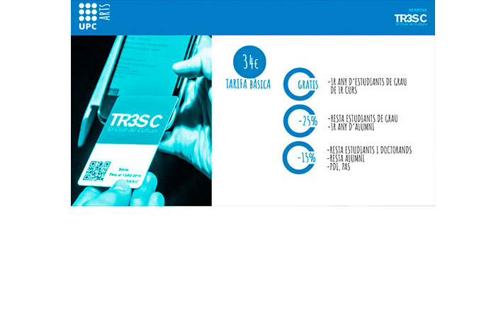 Tender puentes y alianzas entre las ciencias y la tecnología, y el arte y la cultura es el objetivo de la colaboración entre TR3SC y la Universitat Politècnica de Catalunya · BarcelonaTech (UPC), que han acordado proyectar actividades conjuntas en estos ámbitos en un esfuerzo conjunto que lleva por nombre UPCArts. Según el convenio suscrito el 25 de marzo por parte del rector de la UPC, Francesc Torres, y el director del TR3SC, Pepe Zapata, el carné del Club TR3SC (que tiene un coste de 34 euros) será gratuito en la tarifa básica para los estudiantes de primer curso de grado y tendrá un 25% de descuento para el resto de estudiantes de grado y, durante el primer año, para los Alumni UPC. El resto de estudiantes (máster y doctorado), así como el personal docente e investigador y el personal de administración y servicios lo podrán obtener con un 15% de descuento también en la tarifa básica.