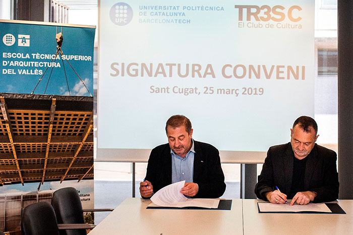 La UPC y el Club Catalán de Cultura (TR3SC) han firmado un acuerdo de colaboración para realizar y fomentar conjuntamente acciones y proyectos en el ámbito cultural y artístico. A partir del próximo curso académico 2019-2020, TR3SC ofrecerá ventajas y descuentos en la obtención del carné de socio del Club TR3SC para los estudiantes, el profesorado, el personal de administración y servicios, y las personas tituladas por la UPC.