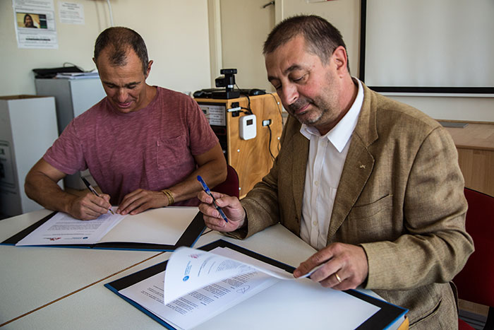 Joan Antoni Tubau, director general de MSF y, a la derecha, Francesc Torres, rector de la UPC, durante la firma del acuerdo. ©MSF/Santiago Dieguez