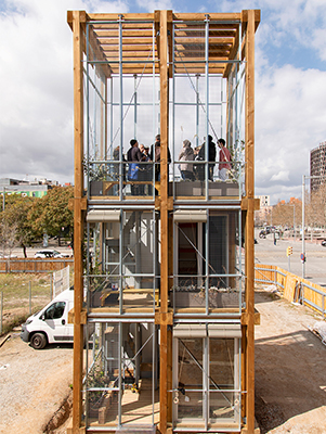 Fotografía frontal del prototipo construido en el Campus Diagonal Besòs, ganador del reto urbano a la regeneración de edificios de viviendas con sistemas innovadores sostenibles. Imagen: José Navarrete, Coleccionistas de momentos