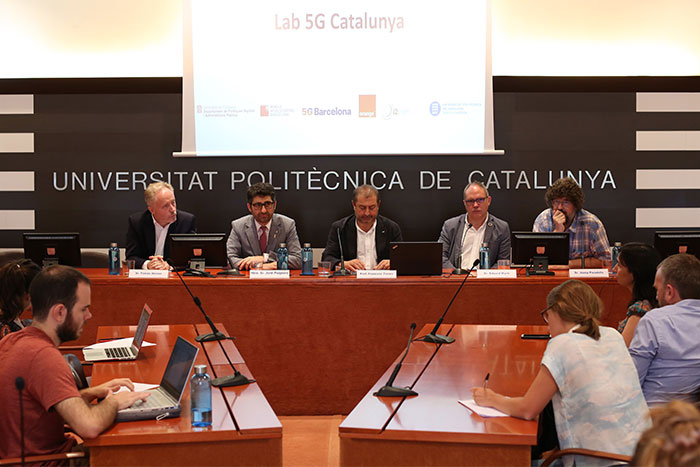 El consejero de Políticas Digitales y Administración Pública de la Generalitat de Catalunya, Jordi Puigneró; el CEO de Mobile World Capital Barcelona, Carlos Grau; el director del programa 5G de MWC Barcelona, Eduard Martín; el rector de la UPC, Francesc Torres; el director de ingeniería de producto de Orange, Tomás Alonso, y el director de i2CAT, Josep Paradells, han firmado el acuerdo de colaboración, el 23 de julio, en el Rectorado de la Universidad. Durante el acto se ha presentado públicamente este primer 'laboratorio abierto 5G' en Catalunya, una iniciativa pionera en toda Europa que convertirá el territorio en un espacio abierto para experimentar y validar nuevos servicios con la tecnología 5G y en entornos reales.