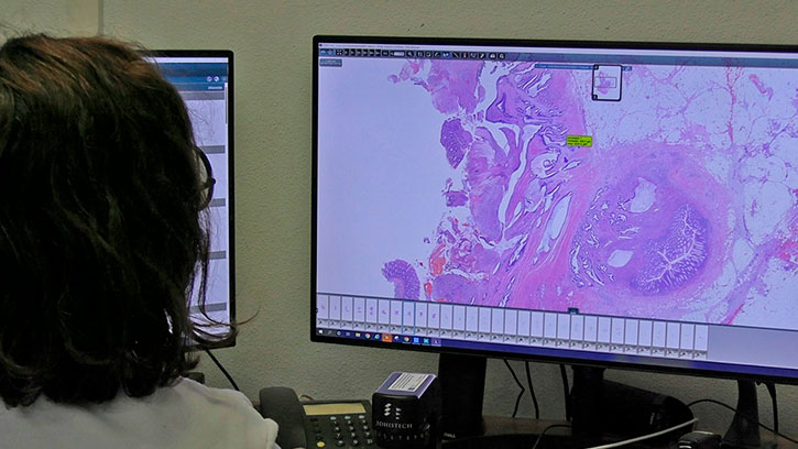Anteriormente, las muestras de tejidos se analizaban a través de microscopios, un proceso que implicaba que los patólogos y patólogas contaran manualmente un número pequeño de células reactivas en las llamadas tinciones inmunohistoquímicas (conjunto de técnicas que permiten detectar la presencia de cáncer). Desde 2022, cuando se empezó a implementar la primera fase del proyecto, relacionada con la digitalización, los hospitales del ICS disponen de 24 escáneres de alta precisión conectados a 13 estaciones para digitalizar las muestras. Esto ha permitido que el número de células analizado por muestra sea muy superior y se puedan compartir, tanto las imágenes como los diagnósticos, en tiempo real y de forma segura, con el resto de hospitales de la red, creando una base de datos común de más de cuatro millones de imágenes digitalizadas.